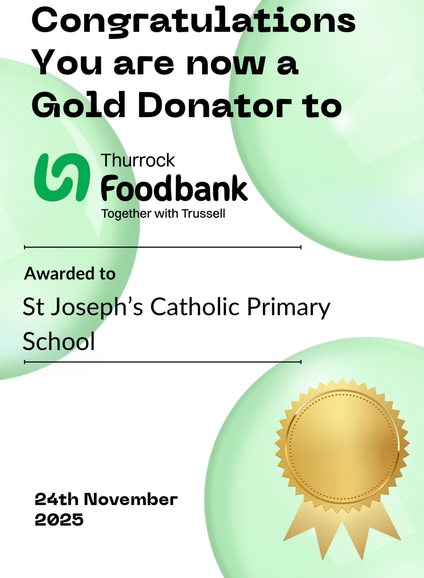 St. Joseph's Catholic Primary School achieves 'Gold Donator' status.