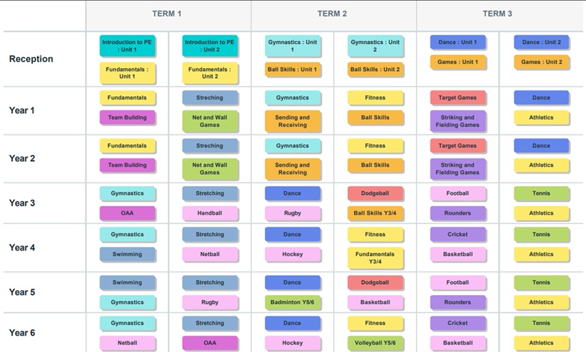We use the GetSet4PE programme, which provides a structured and engaging curriculum. Each unit focuses on a different sport or skill, giving pupils the opportunity to experience a wide range of activities from gymnastics and dance to invasion games, athletics, and outdoor challenges. This variety ensures that every child can discover their strengths and develop a love for being active.